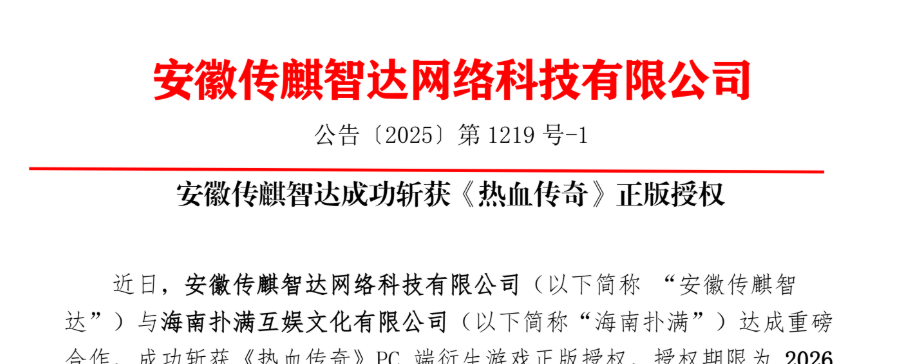 近日,安徽传麒智达网络科技有限公司(以下简称 “安徽传麒智达”)与海南扑满互娱文化有限公司(以下简称“海南扑满”)达成重磅合作,成功斩获《热血传奇》PC 端衍生游戏正版授权,授权期限为 2026 年 1 月 5 日至 2027 年 1 月 4 日。